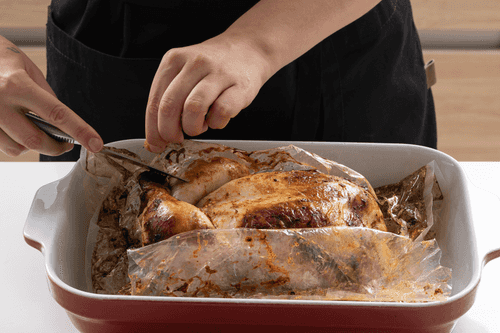Send the chicken in the baking bag to the oven preheated to 180 degrees for 75-90 minutes.