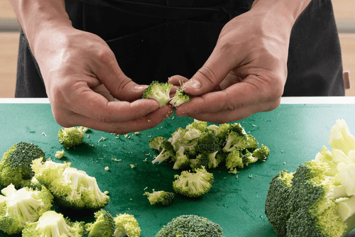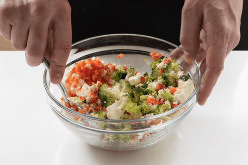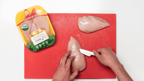 Salt and pepper the chicken fillet to taste. Make a deep cut on the side of each breast to create a pocket. Fill this pocket with vegetable filling.