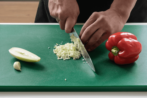 Finely chop the shallots and garlic, and dice the red pepper into 7 mm cubes.