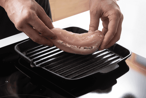 Preheat the grill pan, grease it with vegetable oil, and cook the breasts on one side for 2 minutes to get a golden grill pattern on the meat.