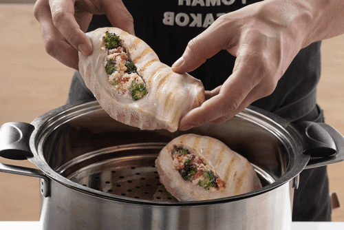 Place the stuffed breasts in the steamer and cook for 20 minutes.