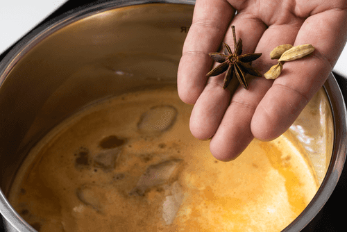 Strain through a sieve, pour the mandarin juice into a saucepan, add sugar, several large pieces of ginger, cardamom, and a star anise. Reduce the juice by three times.