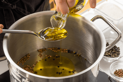 For the brine, pour 2 liters of water into a pot, add 4 tablespoons of salt, 2 tablespoons of sugar, coriander, peppercorns, and olive oil. Bring to a boil. Let it boil for 5 minutes and cool completely.