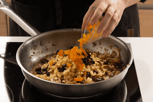 Prepare the filling. Chop the onion into small cubes. Heat butter and vegetable oil in a pan, add chopped rosemary leaves and onion, and sauté for 1-2 minutes until translucent. Add sliced mushrooms and sauté for 7 minutes until golden brown. Finally, add finely chopped dried apricots, raisins (cranberries), diced apple, mix well, drizzle with lemon juice and cool down. Add grated cheese to the minced meat, mix well, season with salt and pepper.