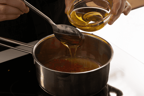 For the glaze, place the zest in a saucepan, pour in orange juice, add honey, soy sauce, and finely chopped chili pepper. Bring the mixture to a boil and let it simmer on low heat for 5-7 minutes until it thickens into a glaze.