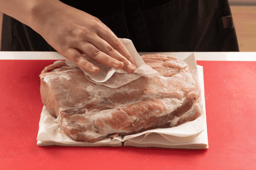 Place the rack in the center of the oven and put a high-sided baking tray underneath it. Preheat the oven to 250 degrees. Wipe the pork loin thoroughly from salt, placing it on the board with the fatty side up. Optionally trim the fat or leave a layer of 0.5 cm.