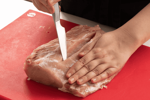 Turn the meat with the fatty side up. Make a cut along the entire piece to a depth of 2 cm, not reaching the edges by 3-5 cm. Insert the knife into the cut and make symmetrical cuts inside the piece at a 45-degree angle on both sides to a depth of about 4 cm to allow more filling to enter.