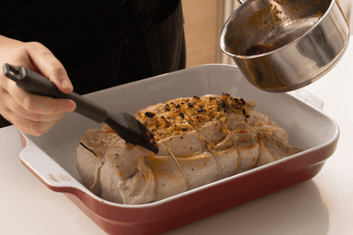 Do not fill the cut with minced meat too tightly. Give the piece its original shape. Tie the meat with twine, wrapping it every 5 cm, place it on a rack cut side up and put it in the oven. After 10 minutes reduce the oven temperature to 120 degrees. Remove the meat and brush it with orange glaze. Cook for 1.5 hours, occasionally taking out the meat and glazing it.