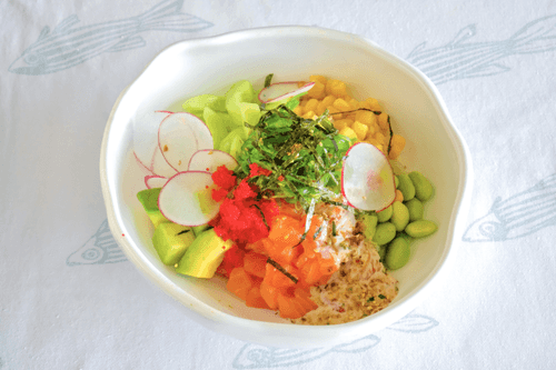 Layer the ingredients on top of the rice in order: salmon, chuka salad, corn kernels, pickled ginger, edamame beans, avocado.