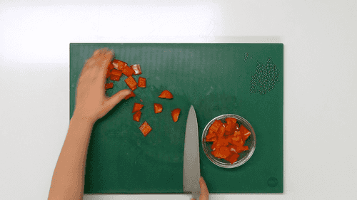 Remove seeds and white veins from the pepper, and cut it into cubes about one centimeter on each side.