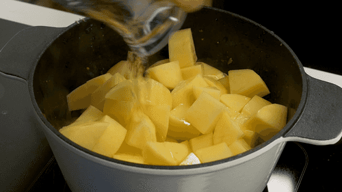 Peel the potato and cut it into large pieces if it's big, or don't cut it at all if the potato is small.