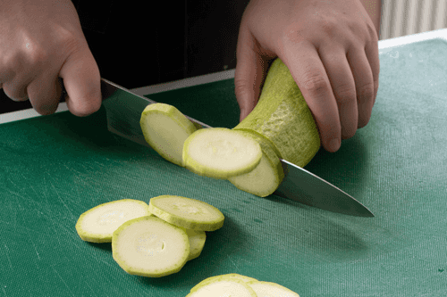 Slice the zucchini into thin rounds; if the skin is tender, it can be left on.