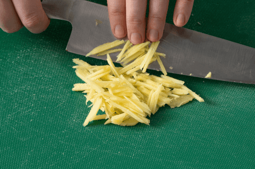 Peel the ginger and cut it into thin strips.