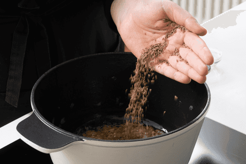 Add crushed cumin between your palms to the onion and continue cooking for a minute until the cumin is fragrant.