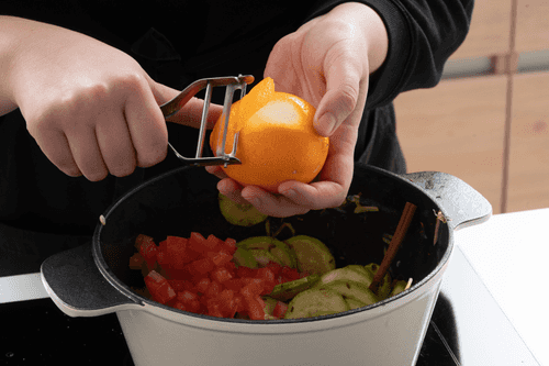 Add tomatoes, 2 strips of lemon zest, nuts, a broken cinnamon stick in half, and cardamom; cook for another 2 minutes while stirring.