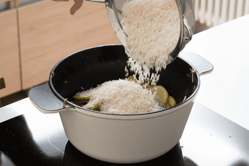Add the rice and mix everything well so that each grain is coated with oil. Pour in the broth, add salt and pepper, bring to a boil, and then reduce the heat to low.