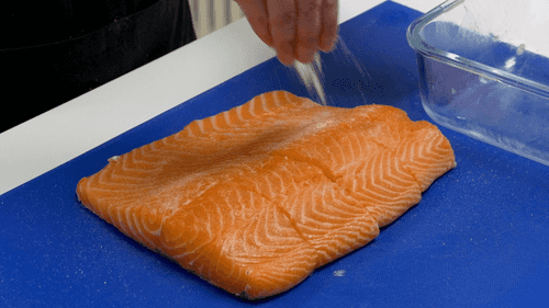 Cut the salmon fillet into portion pieces, sprinkle with salt and pepper.