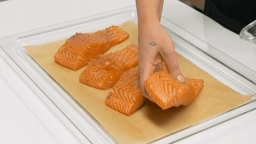 Line a baking tray with parchment paper and place pieces of fish on it.
