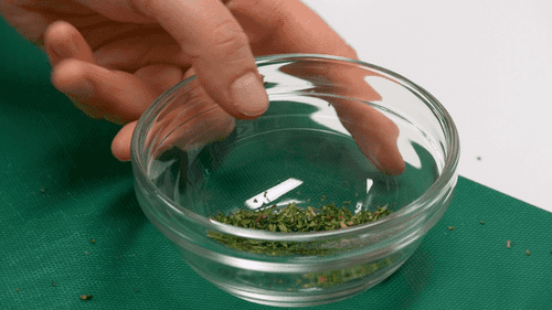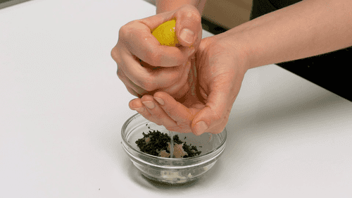 Crush the garlic through a press and mix it with herbs, olive oil, and the juice of half a lemon.
