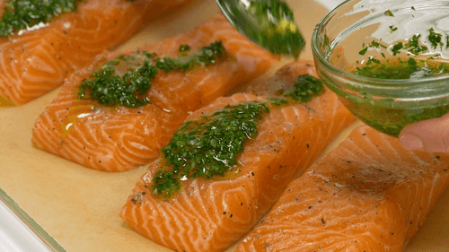 Spread the mixture on each piece of fish and distribute it over the top and sides. Send the fish to an oven preheated to 200 degrees for 12-15 minutes.