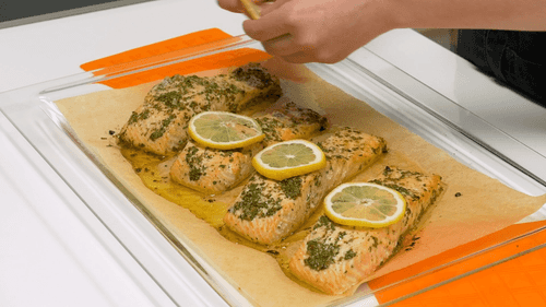 Garnish the cooked salmon with lemon slices and serve immediately.