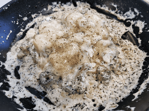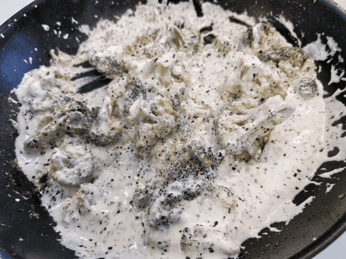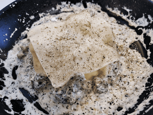 As soon as the cream starts to boil, move all the cabbage to the center of the pan and cover with two pieces of cheese.