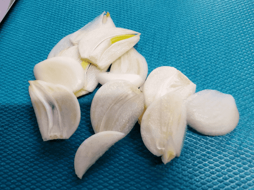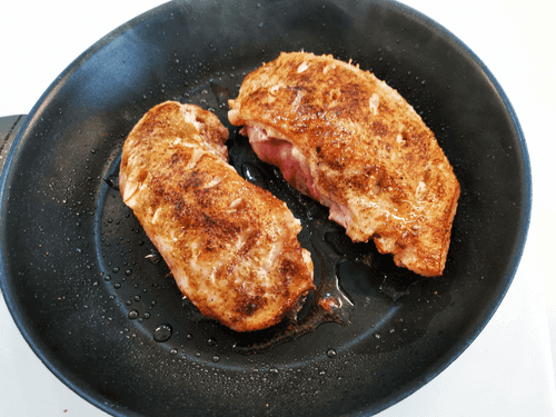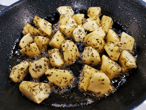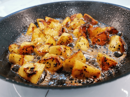 Once the apples are nicely browned, flip them over and continue frying on high heat.