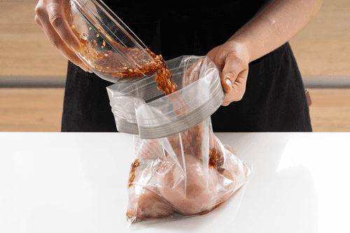 Pour the marinade into the bag with the chicken, seal it and mix. Refrigerate for at least 2 hours, up to overnight.