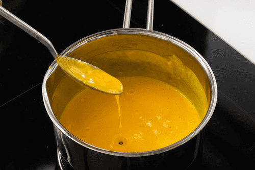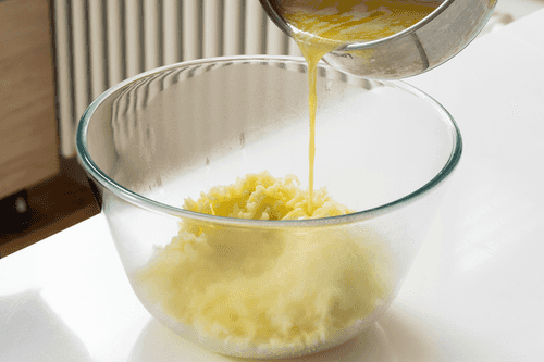Place 40 g of butter in a saucepan, pour milk over it, melt everything together and add salt. Pour the hot mixture into the puree and mix well.