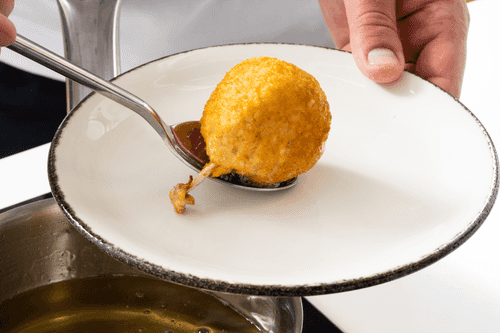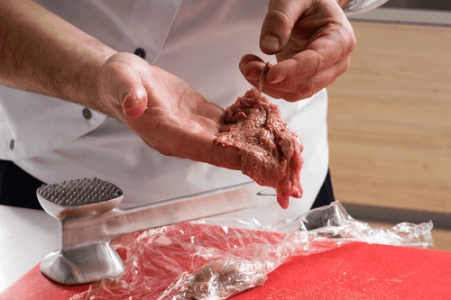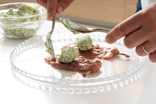 Cover the quenelle with meat on one side, then take the preparation in your palm, shape it into a patty, carefully sealing the edges so that the green butter is inside the meat shell.