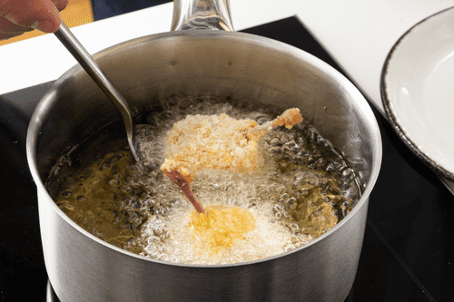 Heat frying oil in a large pot to 185 degrees. If you don't have a thermometer, drop a piece of bread into the oil. If the oil bubbles around it and the piece browns quickly, the oil is hot enough. Lower the patties one by one into the fryer and fry for 3-4 minutes until golden brown. Drain on a paper towel folded several times to remove excess oil.