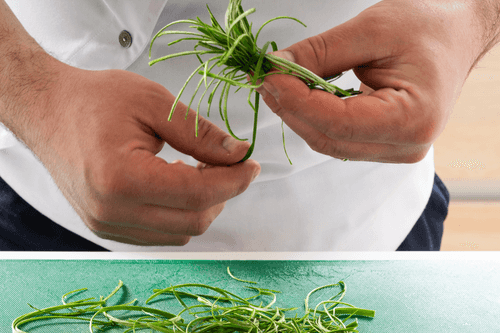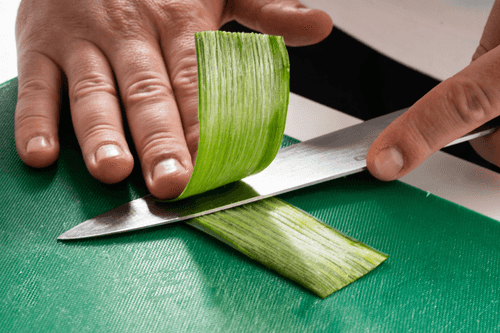 Make papillotes for cutlets: cut the green part of the leek into 6-7 cm pieces. Then slice it into thin strips.