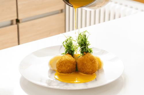 Quail Kiev cutlets with pumpkin sauce and mashed potatoes