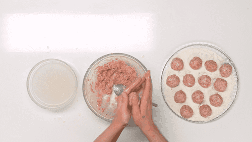 Form small balls from the minced meat and roll them in flour.