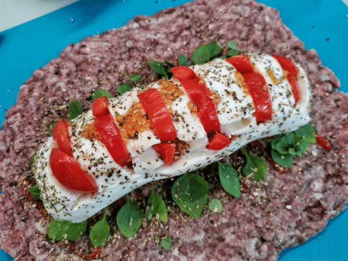 Caprese meatloaf is a true embodiment of Italian culinary passion. It combines the tenderness of ground beef, the velvety texture of mozzarella, and the aroma of fresh basil, creating a refined dish filled with Mediterranean flavors. Its inspiration stems from the famous Caprese salad transformed into a hearty meat treat. Spicy chili sauce adds a slight heat to the loaf, while a blend of Italian herbs adds sophistication. Juicy cherry tomatoes hidden in mozzarella 'pockets' reveal fresh notes in every bite. This loaf is perfect for festive gatherings as well as cozy family dinners, accompanied by a glass of red wine and warm conversation.