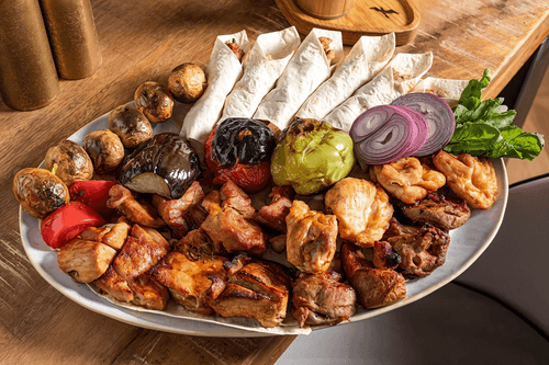 Assorted kebabs with satsebeli sauce