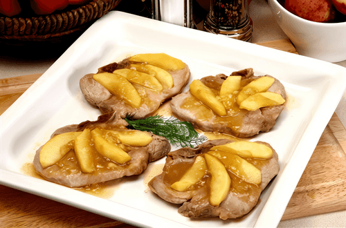 Place the meat in a heatproof dish and arrange the apples on top. Put it in an oven preheated to 250 degrees and bake for about 45 minutes until done. Before serving, cut the meat into portions and garnish each piece with apple slices.