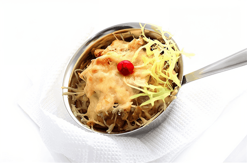 Chicken julienne with olives is a refined dish of French cuisine that embodies the harmony of flavors and textures. Tender chicken fillet, fried to a golden crust, combines with tangy olives and caramelized onions to create a rich bouquet of flavors. The creamy sour cream sauce with a hint of flour gives the dish a velvety consistency, while the baked cheese forms an appetizing golden crust. This julienne not only pleases the eye but also envelops with aromas that awaken the appetite. Ideal as an exquisite appetizer or main course on a festive table, it pairs well with white wine and fresh baguette, highlighting its sophistication and nobility. Simple to prepare yet elegant in presentation — a true gastronomic find!
