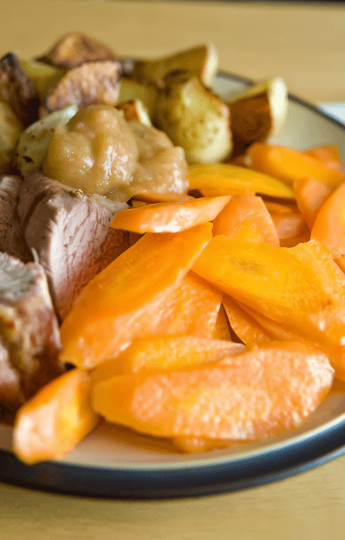 Cut the peeled carrots into wedges, place them in a pot, add a little broth or water, add 1/2 tablespoon of oil, salt, and sugar, cover, and simmer for 20-30 minutes.
