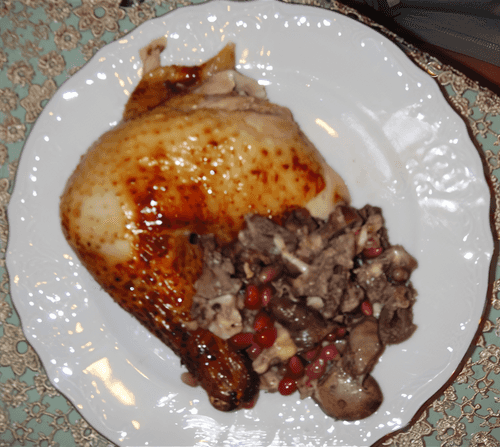 We salt and pepper the chicken, place it on a baking sheet, and put it in the oven on a fairly high heat. Periodically, we take out the baking sheet and drizzle the chicken with pomegranate juice and the fat that comes from the chicken to keep it from drying out. The pomegranate juice adds a tangy flavor.