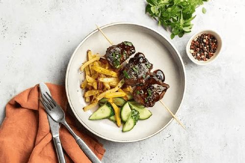 Another oven-baked shashlik recipe, this time made from marbled beef. The main character is a spicy marinade of paprika, lemon juice, vegetable oil and pepper, which perfectly highlights the brutal texture of the meat.