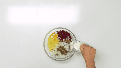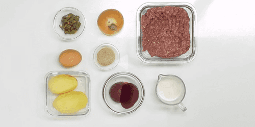 Mix the minced meat with prepared vegetables, capers, cream, and egg. Add salt, pepper, and a bit of beet marinade to achieve a pink hue and the desired thickness of the mince.