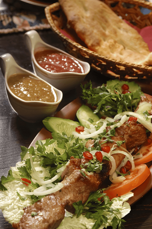 Skewer the meat and grill until golden brown — ideally over an open fire or at least on a grill. In principle, it can also be done in a pan. The main thing is not to overcook: the meat should remain juicy, as mcvadi requires.