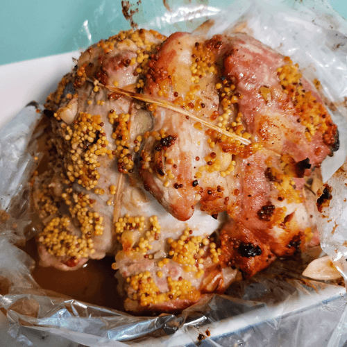 Place the pork in a roasting bag, tying it at both ends and making a few small holes. Send it to a preheated oven at 200 degrees for 1 hour and 20 minutes.