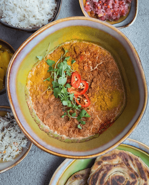 A thick brew of lentils, coconut milk, tomatoes, flavored with bright Ceylon spices - turmeric, cinnamon and chili. A dish that warms you up from the inside and is very filling, despite the absence of meat. Recipe from Bistro Ceylon.