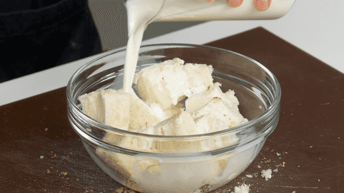 Cut the crusts off the bread, soak it in milk, and let it sit for 15 minutes.