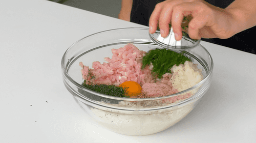 Add an egg, herbs, salt, and pepper to the minced meat. Mix well.