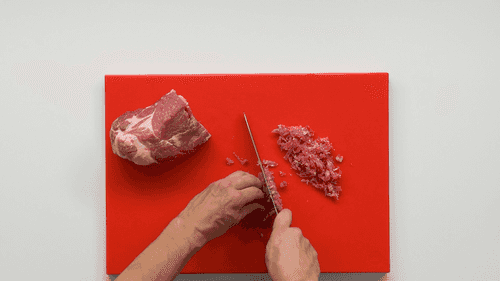 Remove excess membranes from the pork and chop it very finely. To make it easier to cut the meat, it can be pre-frozen.