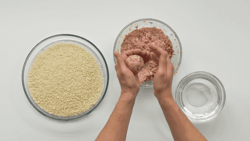 Form small patties from the minced meat and coat them in breadcrumbs.