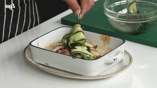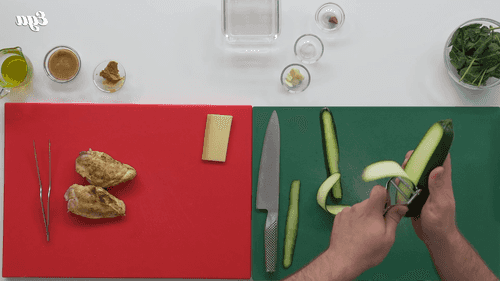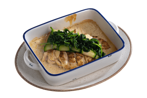 Roll zucchini ribbons into a ring and place on chicken fillet. Top with blanched spinach. Serve immediately.